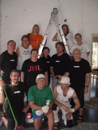 Runsaan vierailuohjelman vuoksi pääsimme vasta iltapäivällä aloittamaan työt. Onneksi tarvikkeet oli ostettu jo edellisenä päivänä. Aluksi seinät kuivaharjattiin ja näin päästiin hämähäkinseiteistä ja vuosien aikana kertyneestä pölystä. WC-tilat siivosimme perusteellisesti.