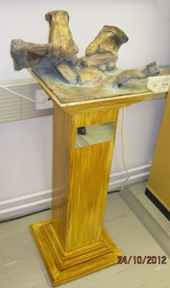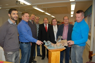 Taiteilija Erkki Liukkonen luovuttaa PJ Tarmo Pekoselle "kakunjako" veistoksen 16.10.2012